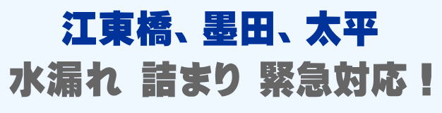 江東橋、墨田、太平での水の困った即解決!急な水道トラブルに緊急でかけつけ訪問し、蛇口の水漏れ、トイレ詰まり、排水の溢れ、タンクの故障など修理いたします。