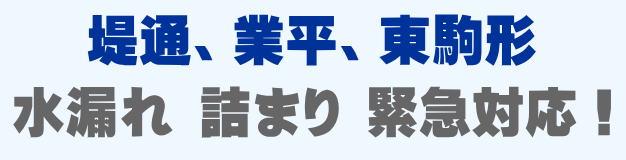堤通、業平、東駒形での水の困った即解決!急な水道トラブルに緊急でかけつけ訪問し、蛇口の水漏れ、トイレ詰まり、排水の溢れ、タンクの故障など修理いたします。
